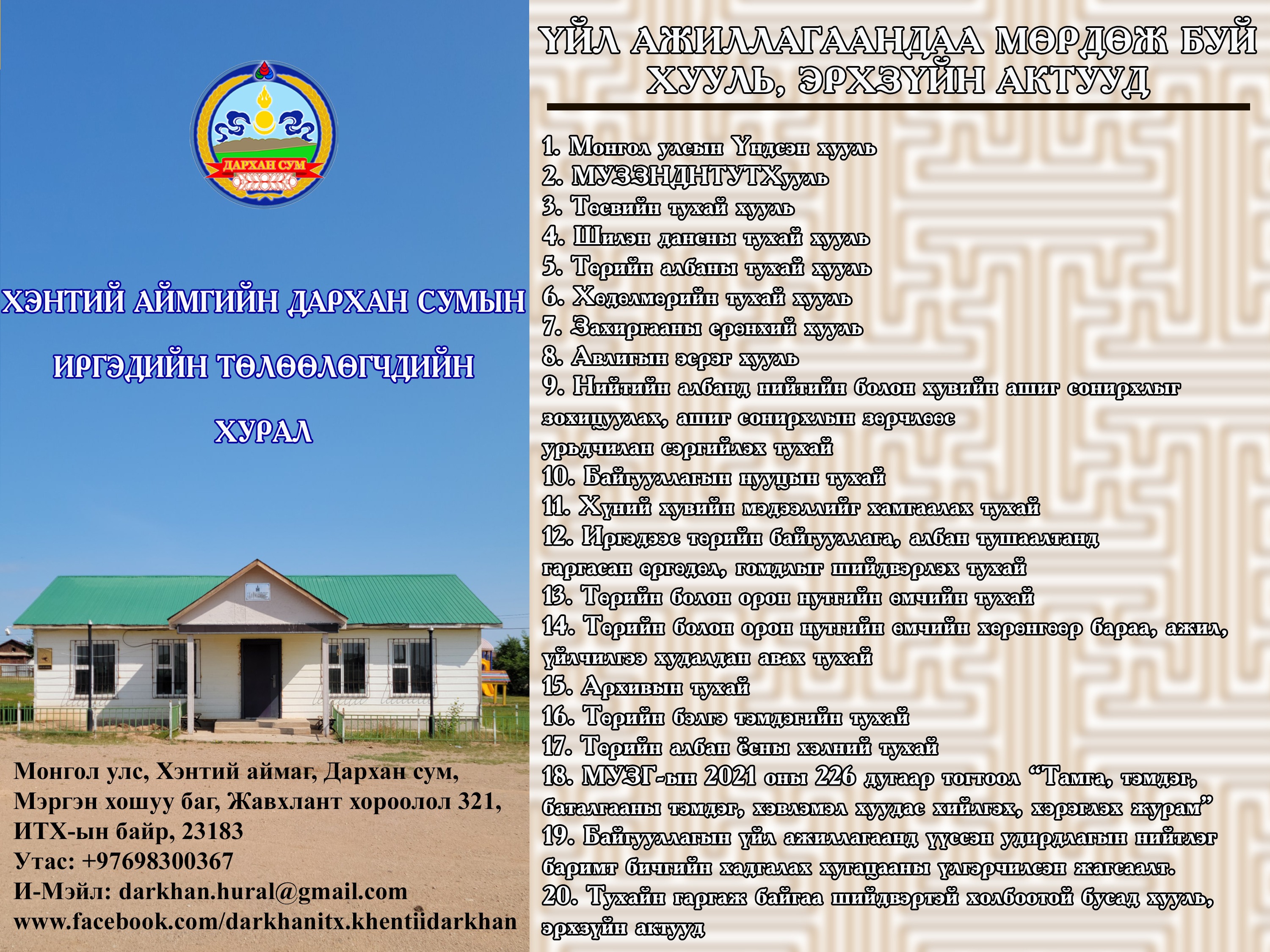 ДАРХАН СУМЫН ИРГЭДИЙН ТӨЛӨӨЛӨГЧДИЙН ХУРЛЫН ҮЙЛ АЖИЛЛАГААНД МӨРДӨГДӨЖ БУЙ ХУУЛЬ ТОГТООЖИЙН ЖАГСААЛТ