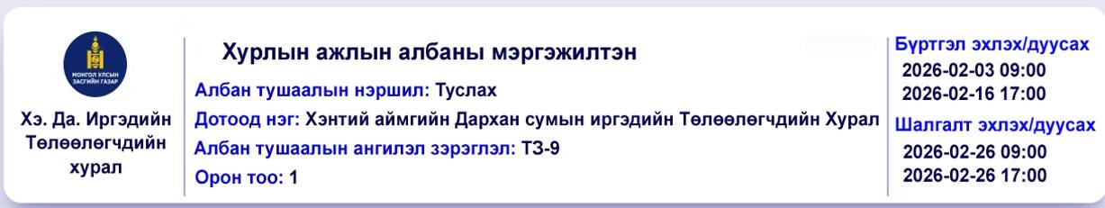 Дархан сумын иргэдийн Төлөөлөгчдийн Хурлын ажлын албаны мэргэжилтний сул орон тоо зарлагдсан тул ажилд орох хүсэлтэй иргэд төрийн албаны шалгалтад хамрагдана уу. Шалгалтын бүртгэл 2026 оны 02 сарын 16-ны өдрийн17:00 цаг хүртэл явагдаж шалгалт 2026 оны 02 сарын 26-ны өдрийн 0Дархан сумын иргэдийн Төлөөлөгчдийн Хурлын ажлын албаны мэргэжилтний сул орон тоо зарлагдсан тул ажилд орох хүсэлтэй иргэд төрийн албаны шалгалтад хамрагдана уу. Шалгалтын бүртгэл 2026 оны 02 сарын 16-ны өдрийн17:00 цаг хүртэл явагдаж шалгалт 2026 оны 02 сарын 26-ны өдрийн 09:00 цагт эхэлнэ.9:00 цагт эхэлнэ.Дархан сумын иргэдийн Төлөөлөгчдийн Хурлын ажлын албаны мэргэжилтний сул орон тоо зарлагдсан тул ажилд орох хүсэлтэй иргэд төрийн албаны шалгалтад хамрагдана уу. Шалгалтын бүртгэл 2026 оны 02 сарын 16-ны өдрийн17:00 цаг хүртэл явагдаж шалгалт 2026 оны 02 сарын 26-ны өдрийн 09:00 цагт эхэлнэ.